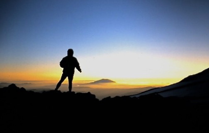 Mt.Saint Helens at sunset in the distance, Silhouette is of my climbing partner.