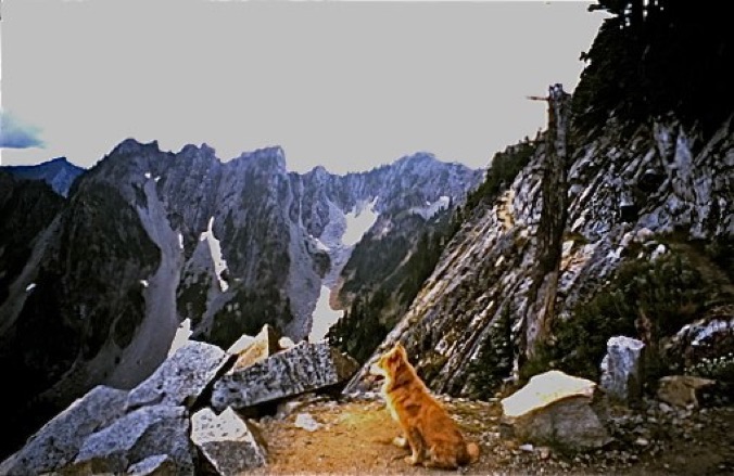 A fantastic photo of our dog “Sheba” staring out into paradise from the unreal perch known as the Kendall Katwalk on the Pacific Crest Trail.